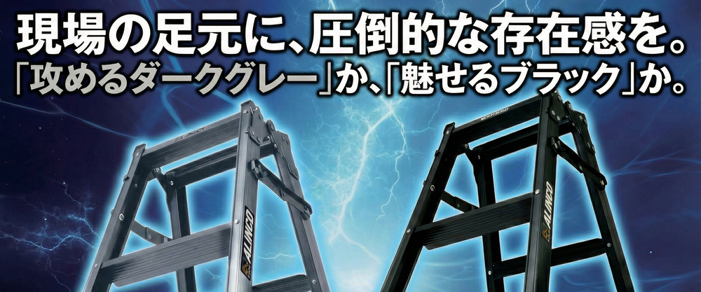 ALINCOが送り出すW55 GranGearは、ワイドステップ55mmの踏み幅と、全ステップに施された滑り止めテープで、足元の不安を根こそぎ排除する。高所での集中力を、道具が支えます。